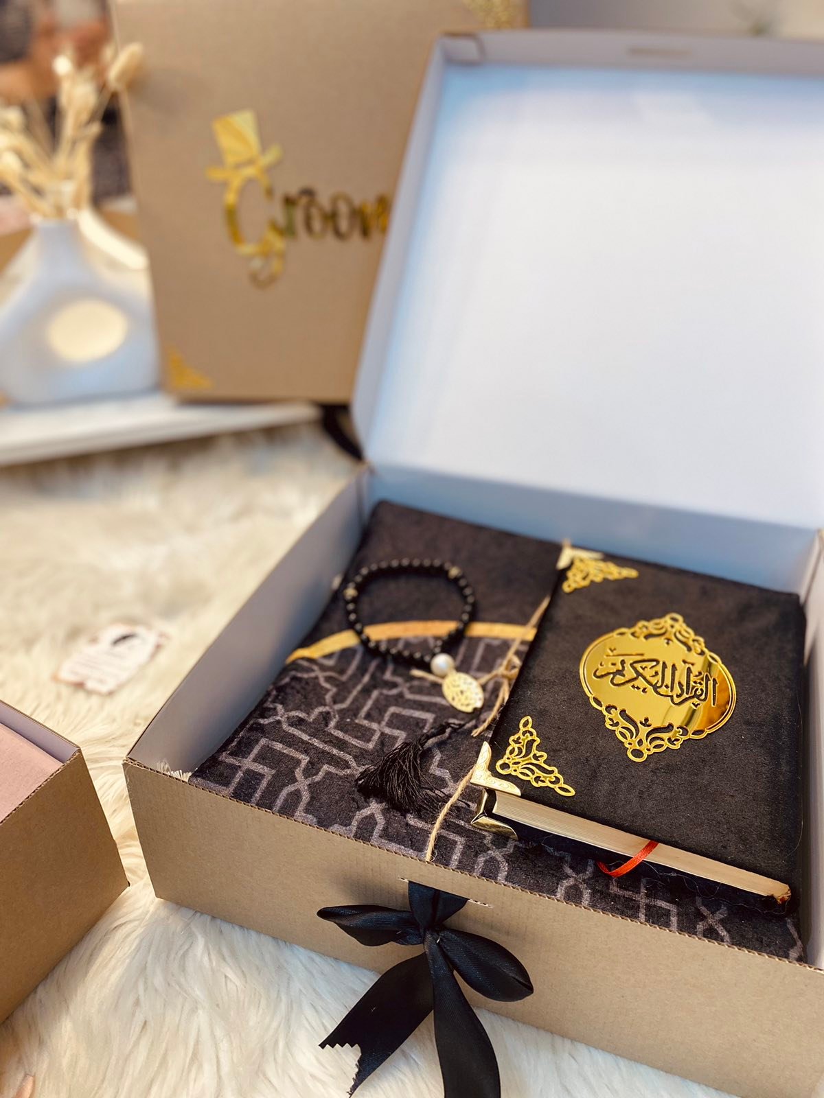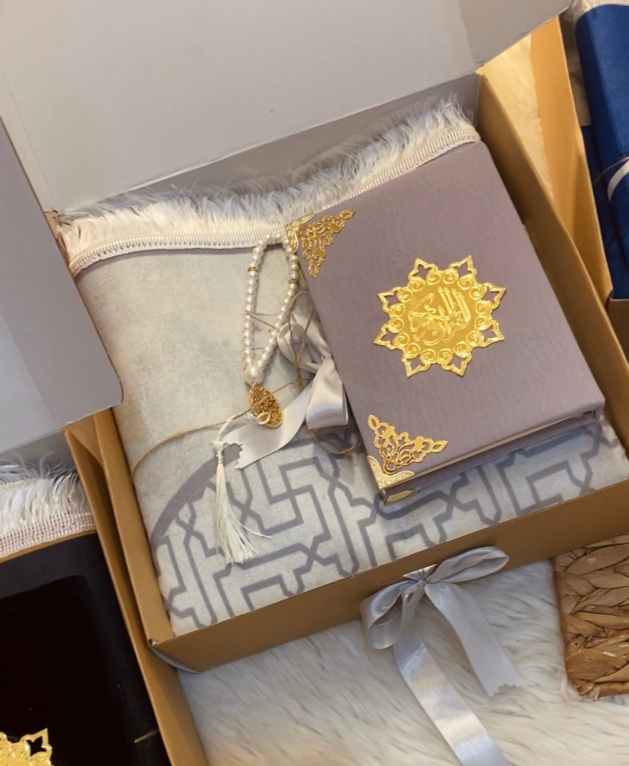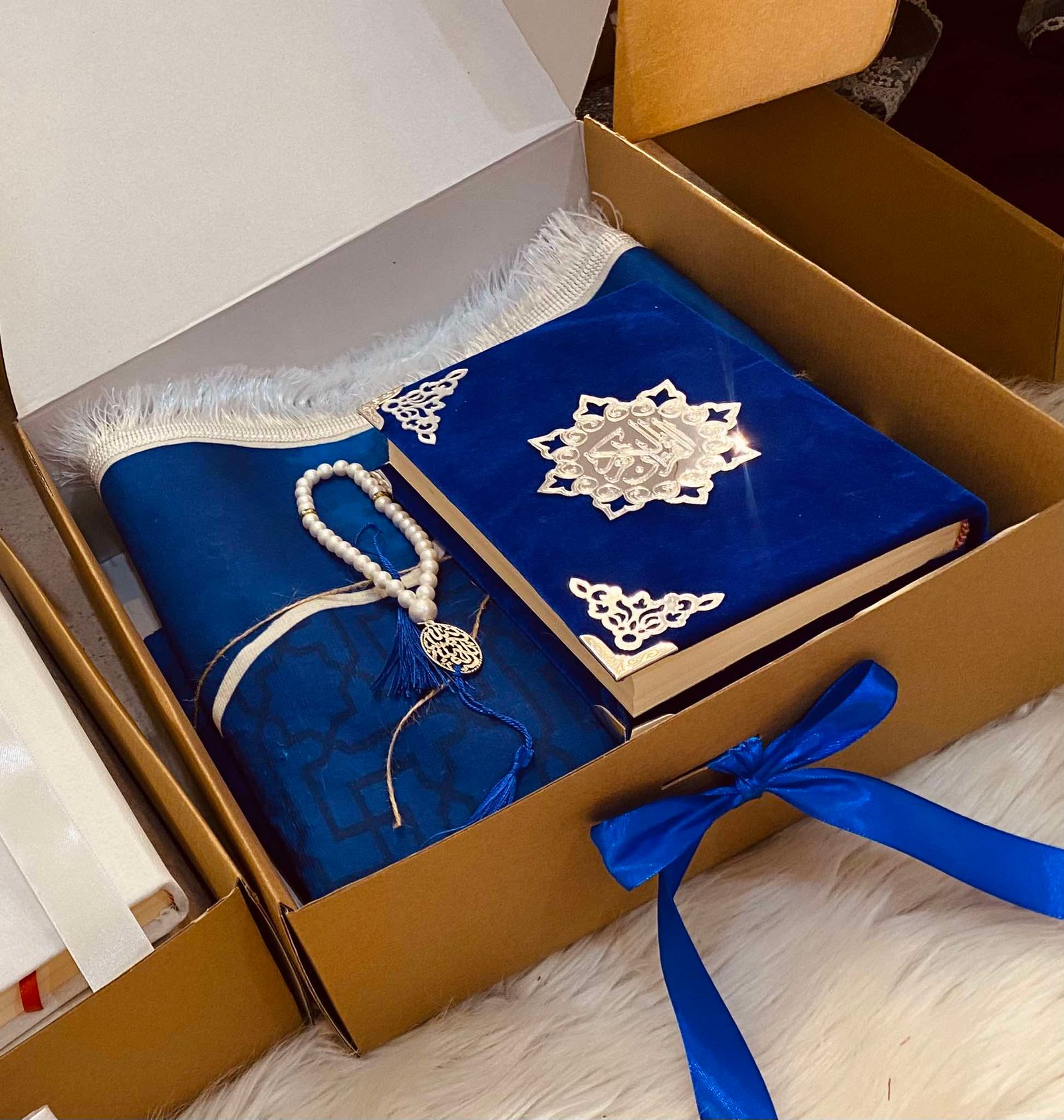 بوكس رجالي bleu roi فيه مصحف مغلف و سجادة خشينة و سبحة